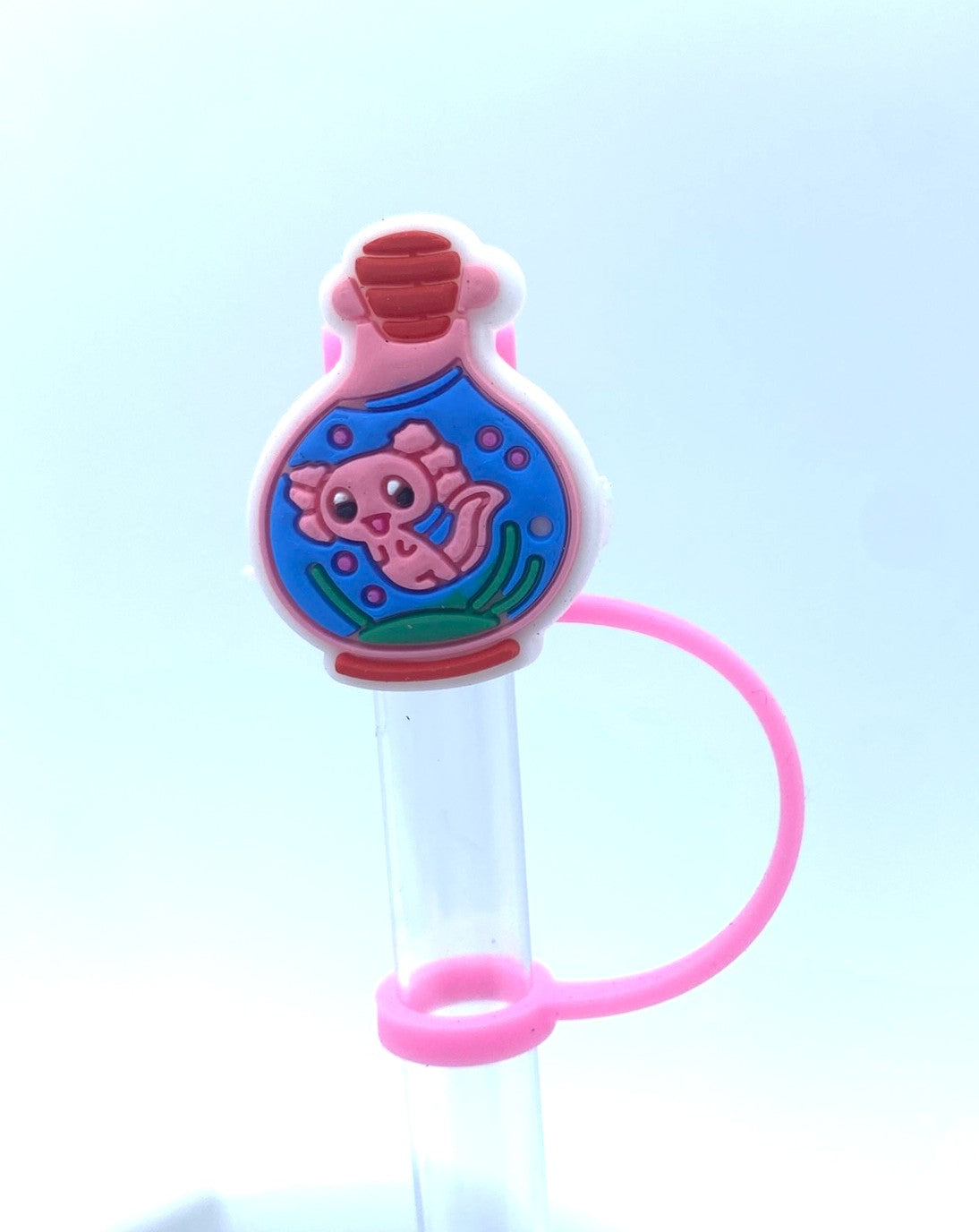 Accessorize your favorite tumbler cup with this adorable Axolotl In Bottle Straw Topper. This cover fits 10mm/0.4inch straws and is compatible with Stanley 30 & 40 oz tumblers straws. Made from silicone.