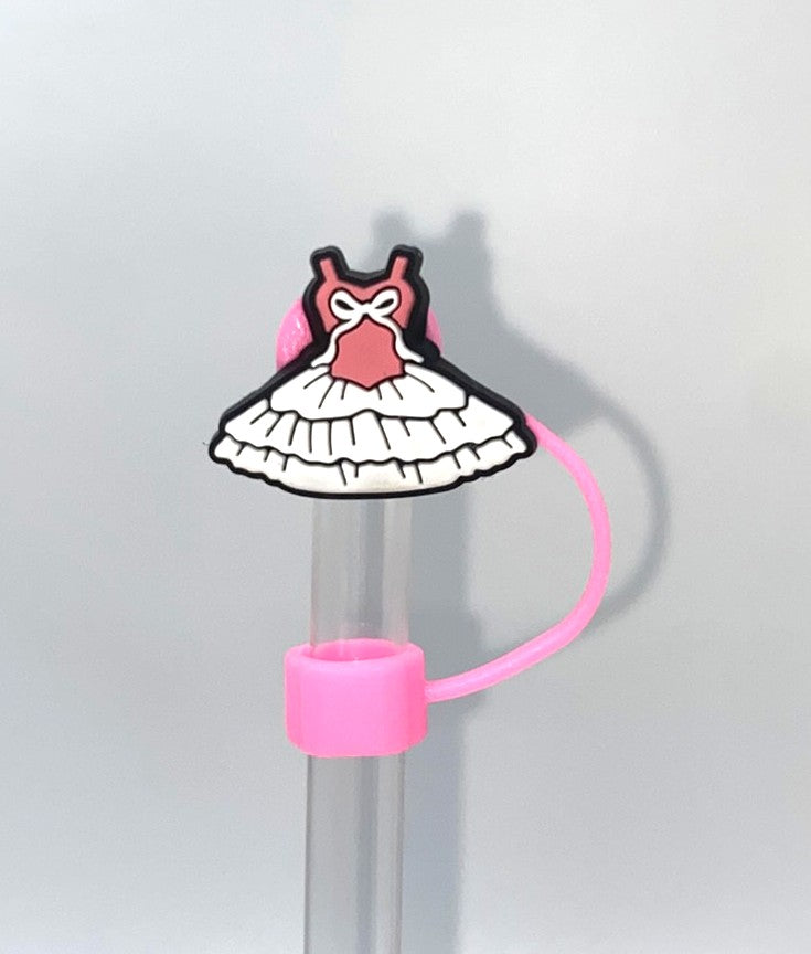 Accessorize your favorite tumbler cup with this adorable Ballerina Tutu Costume Pink & White Bow Straw Topper. This cover fits 10mm/0.4inch straws and is compatible with Stanley 30 & 40 oz tumblers straws. Made from silicone.