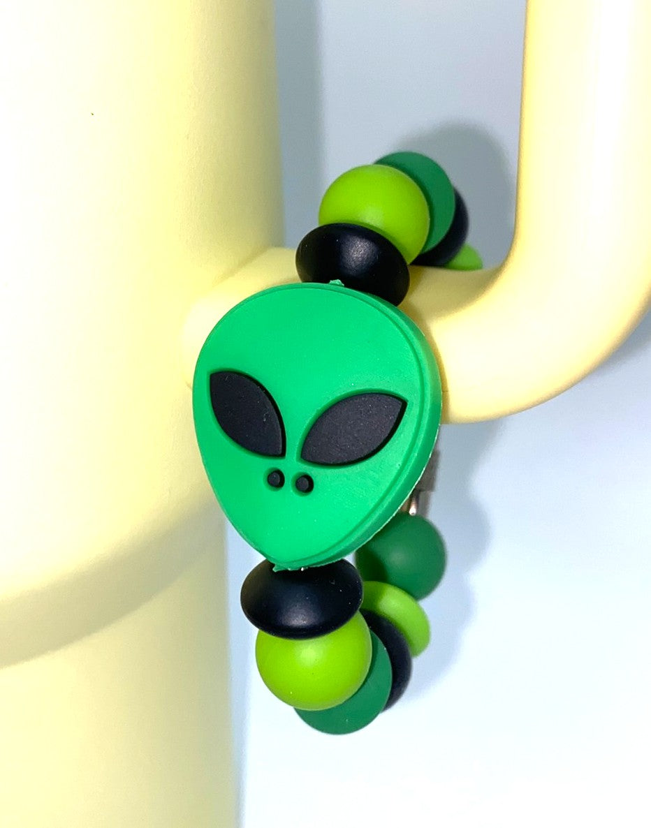Accessorize your tumbler cup with this adorable Bright Green Alien Head Glitter silicone bead cup charm. These cup charms are made to clasp around your favorite tumbler's handle. They are simple to take off and put on, so depending on your mood for the day, you can swap them out easily!