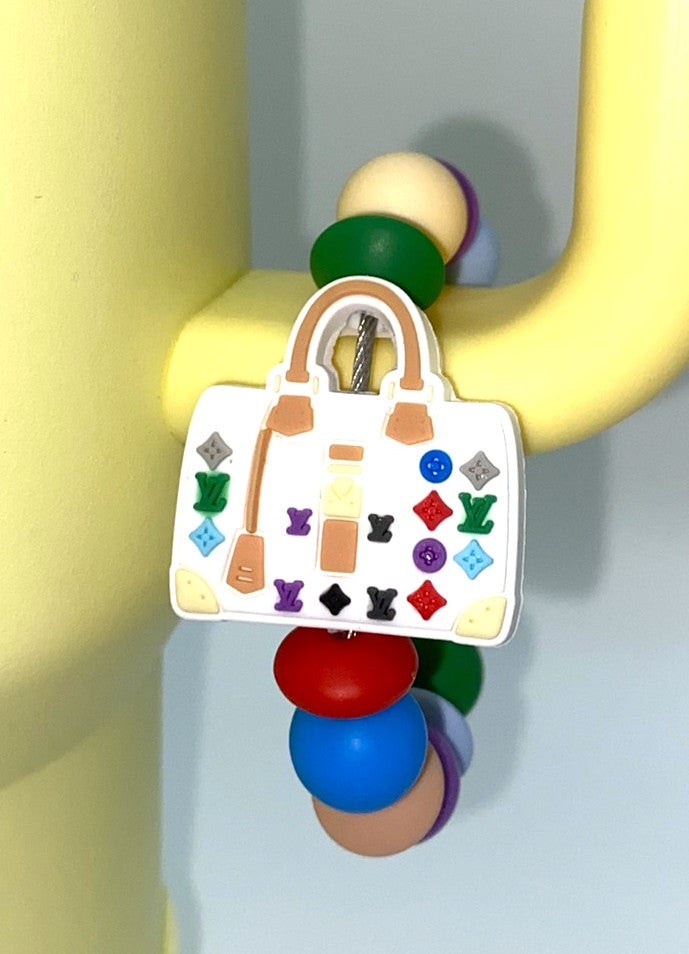 Accessorize your tumbler cup with this beautiful Designer LV White Colorful Purse Handbag silicone bead cup charm. These cup charms are made to clasp around your favorite tumbler's handle. They are simple to take off and put on, so depending on your mood for the day, you can swap them out easily!