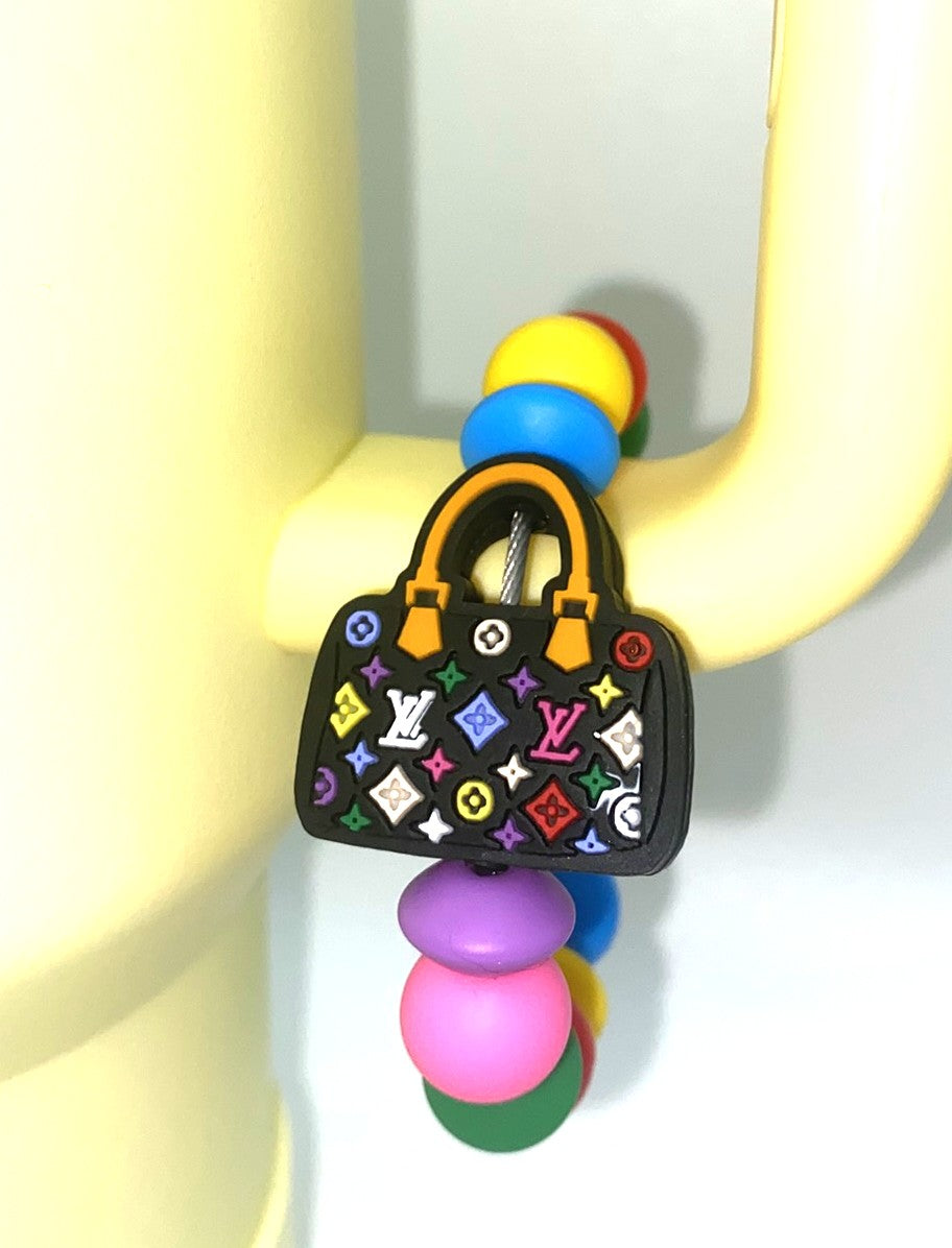 Accessorize your tumbler cup with this beautiful Designer LV Black Colorful Purse Handbag silicone bead cup charm. These cup charms are made to clasp around your favorite tumbler's handle. They are simple to take off and put on, so depending on your mood for the day, you can swap them out easily!