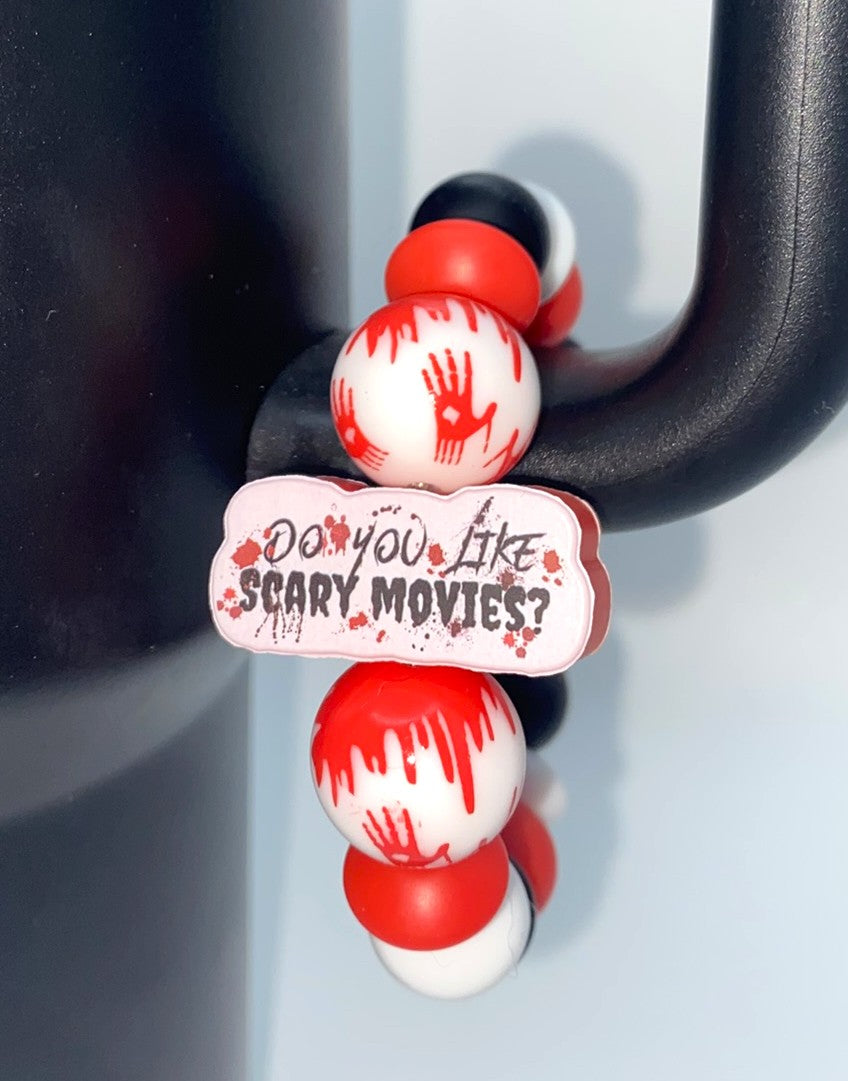 Accessorize your tumbler cup with this adorable Do You Like Scary Movies Scream Ghost Face Horror Villain silicone bead cup charm. These cup charms are made to clasp around your favorite tumbler's handle. They are simple to take off and put on, so depending on your mood for the day, you can swap them out easily!