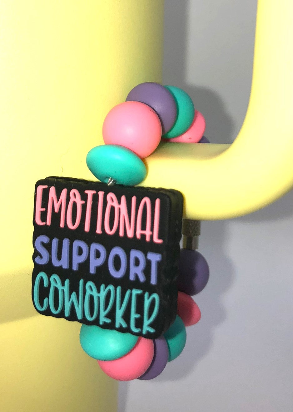 Accessorize your tumbler cup with this funny Emotional Support Coworker silicone bead cup charm. These cup charms are made to clasp around your favorite tumbler's handle. They are simple to take off and put on, so depending on your mood for the day, you can swap them out easily!