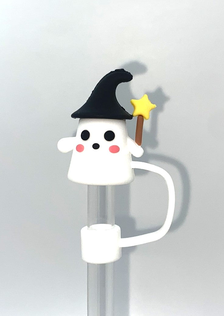 Accessorize your favorite tumbler cup with this adorable 3D Ghost with Black Witch Hat & Magic Wand Halloween Straw Topper. This cover fits 10mm/0.4inch straws and is compatible with Stanley 30 & 40 oz tumblers straws. Made from silicone.