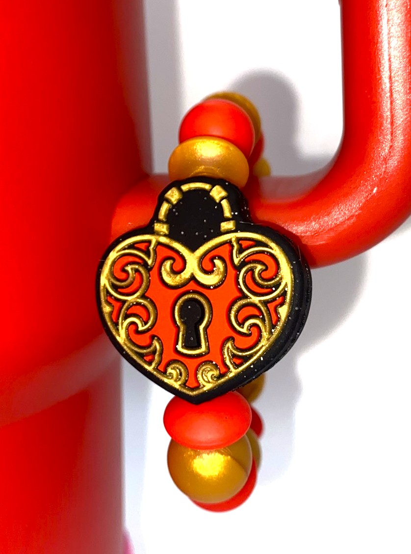 Accessorize your tumbler cup with this adorable Heart Locket Red & Gold Glitter Valentine silicone bead cup charm. These cup charms are made to clasp around your favorite tumbler's handle. They are simple to take off and put on, so depending on your mood for the day, you can swap them out easily!