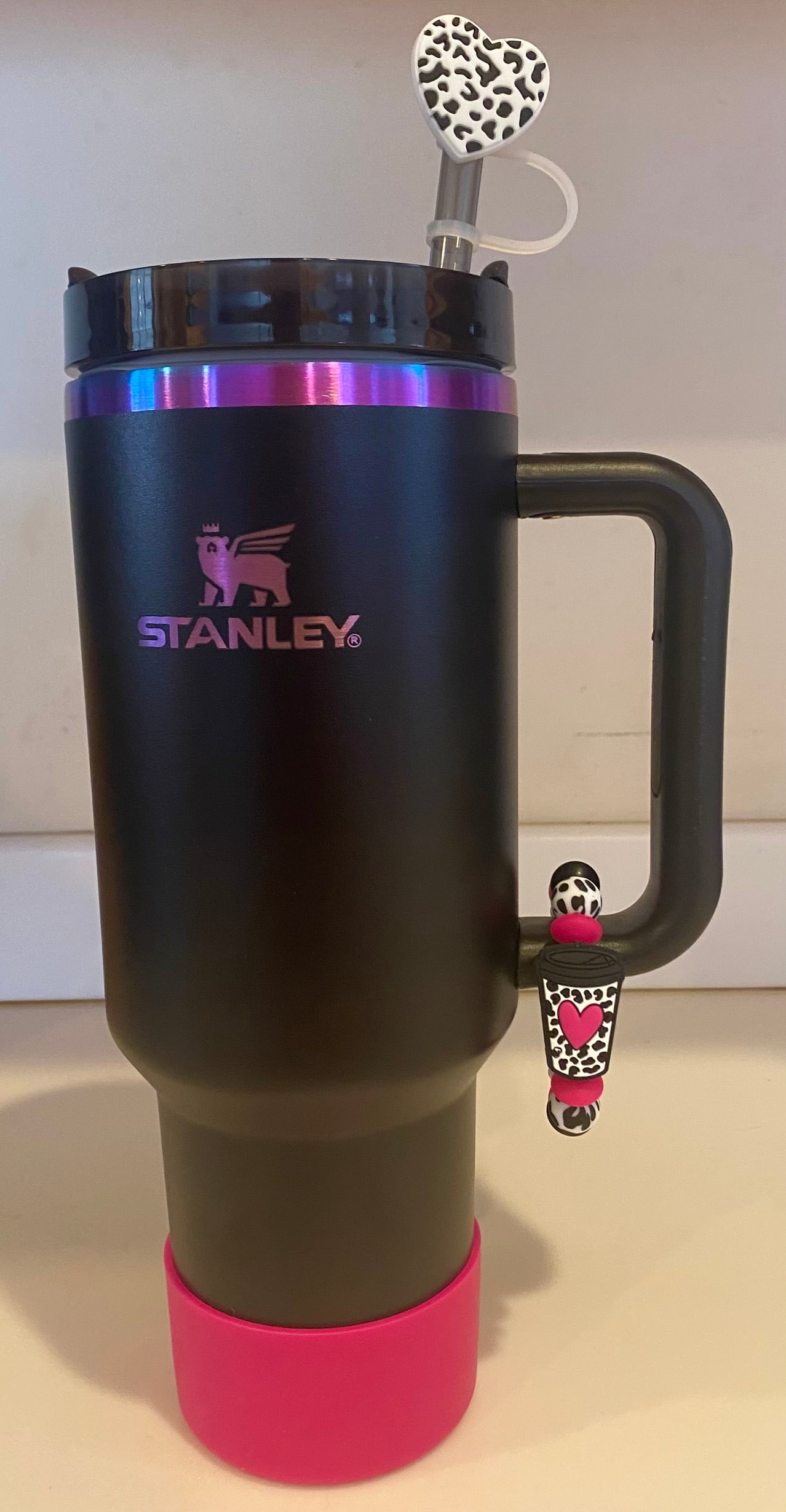 Accessorize your favorite tumbler cup with this adorable Heart White & Black Cow Print #2 Straw Topper. This cover fits 10mm/0.4inch straws and is compatible with Stanley 30 & 40 oz tumblers straws. Made from silicone.