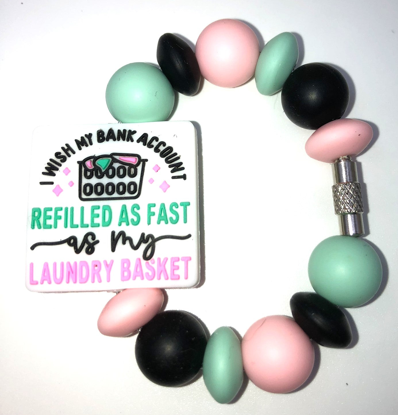 Accessorize your tumbler cup with this funny I Wish My Bank Account Refilled As Fast As My Laundry Basket silicone bead cup charm. These cup charms are made to clasp around your favorite tumbler's handle. They are simple to take off and put on, so depending on your mood for the day, you can swap them out easily!
