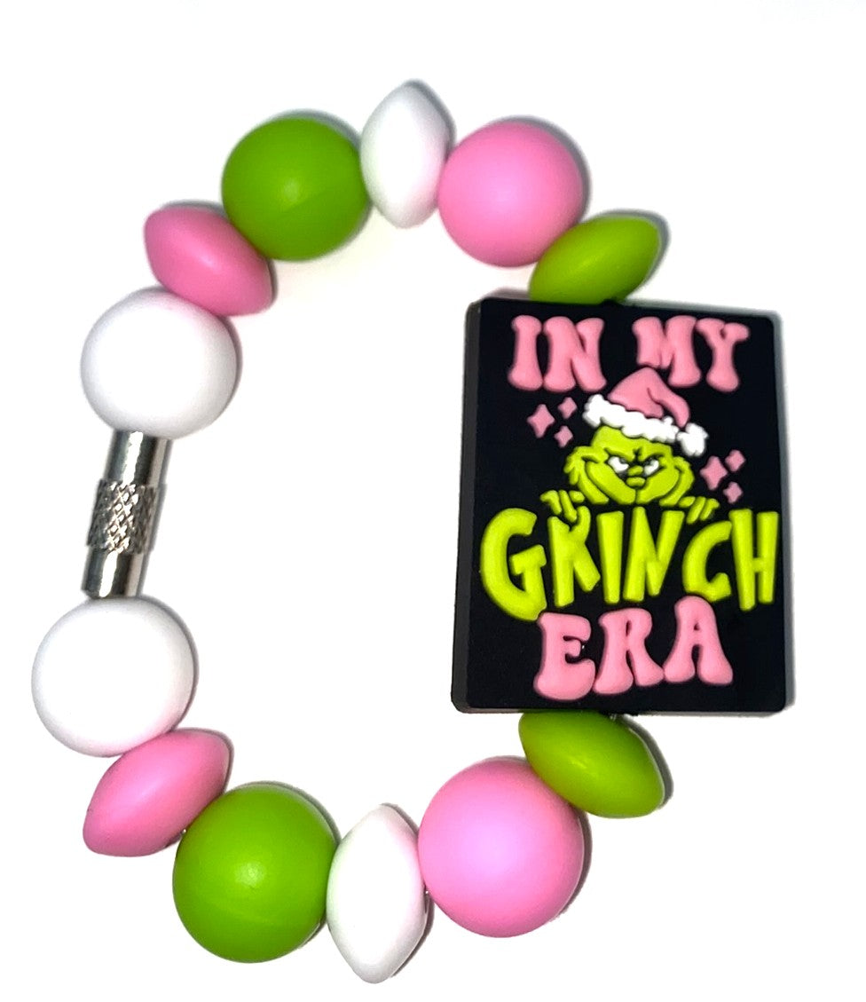Accessorize your tumbler cup with this adorable In My Grinch Era Mean Green Guy silicone bead cup charm. These cup charms are made to clasp around your favorite tumbler's handle. They are simple to take off and put on, so depending on your mood for the day, you can swap them out easily!