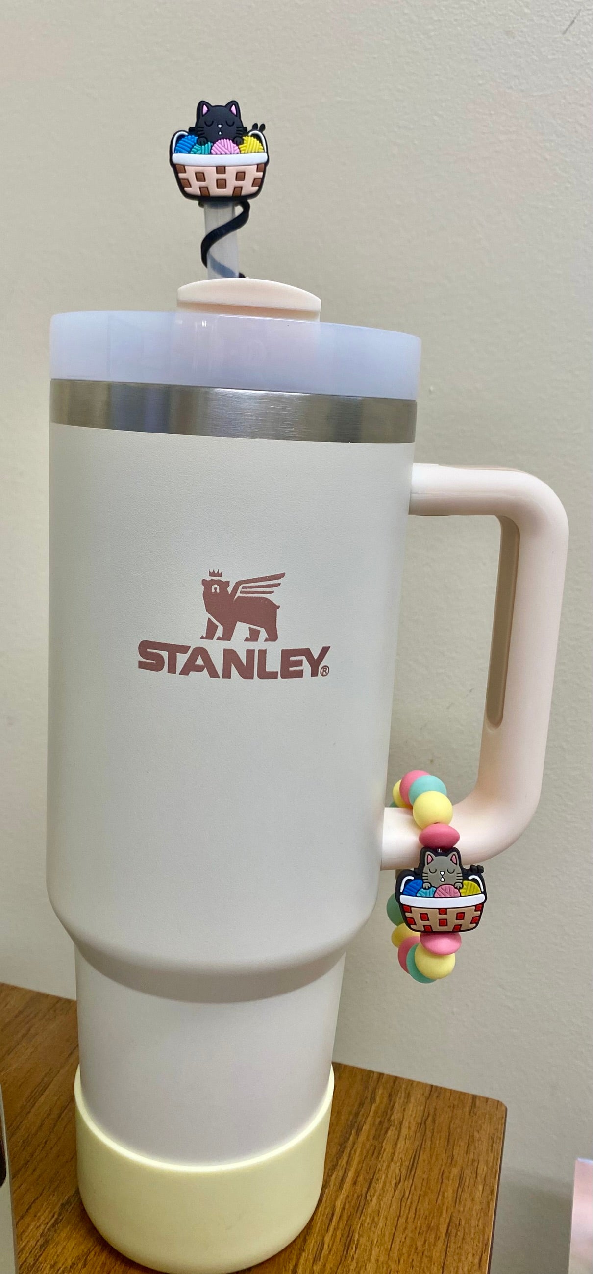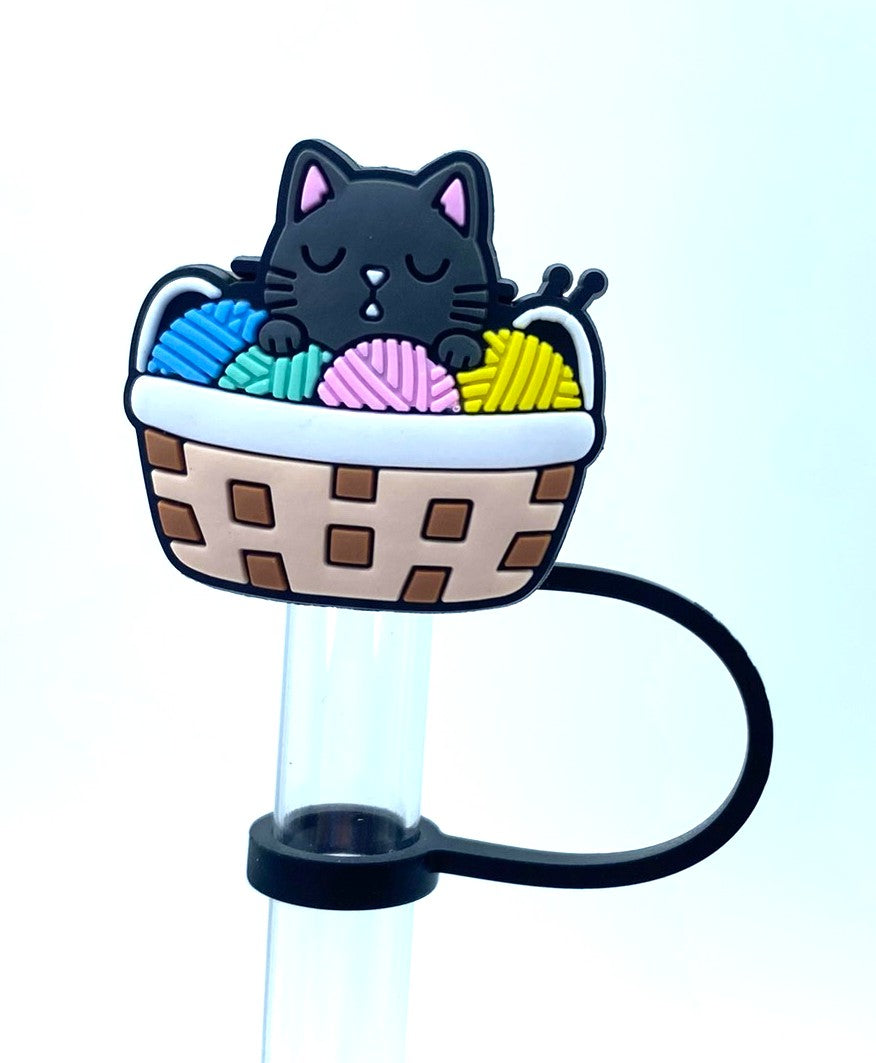 Accessorize your favorite tumbler cup with this adorable Kitty Cat In Basket Of Yarn Straw Topper. This cover fits 10mm/0.4inch straws and is compatible with Stanley 30 & 40 oz tumblers straws. Made from silicone.