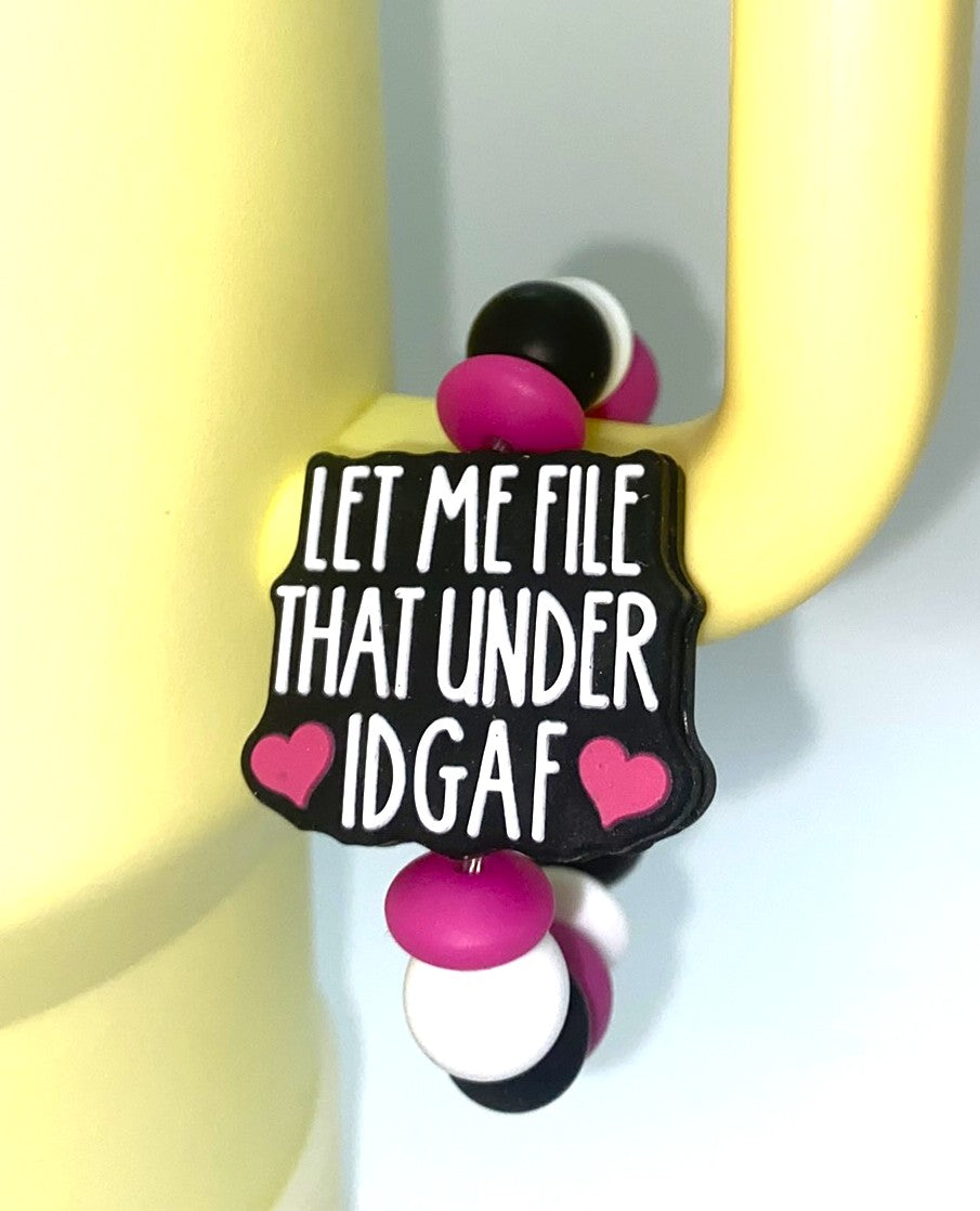Accessorize your tumbler cup with this funny Let Me File That Under IDGAF silicone bead cup charm. These cup charms are made to clasp around your favorite tumbler's handle. They are simple to take off and put on, so depending on your mood for the day, you can swap them out easily!