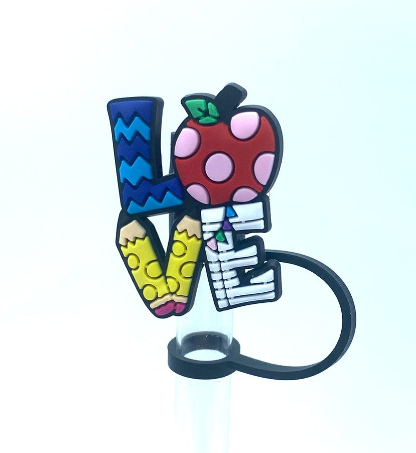 Accessorize your favorite tumbler cup with this adorable Love Teacher Apple Pencils Notebook Paper Straw Topper. This cover fits 10mm/0.4inch straws and is compatible with Stanley 30 & 40 oz tumblers straws. Made from silicone.