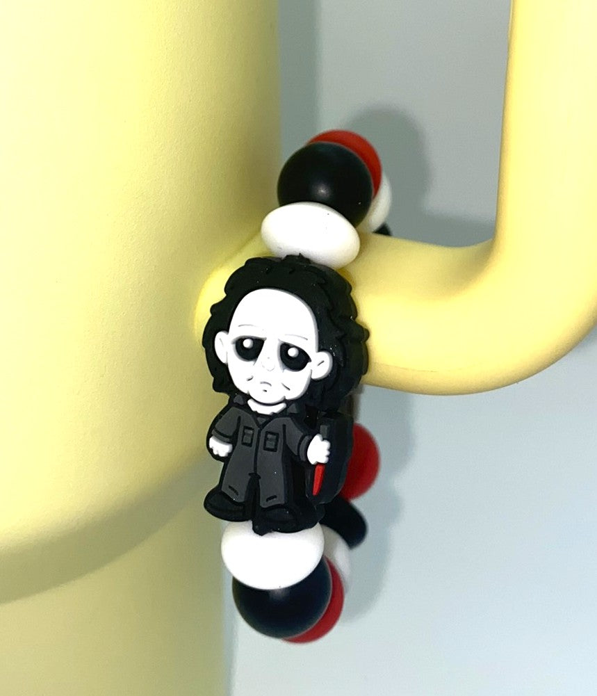 Accessorize your tumbler cup with this adorable Michael Myers Halloween Horror Villain silicone bead cup charm. These cup charms are made to clasp around your favorite tumbler's handle. They are simple to take off and put on, so depending on your mood for the day, you can swap them out easily!