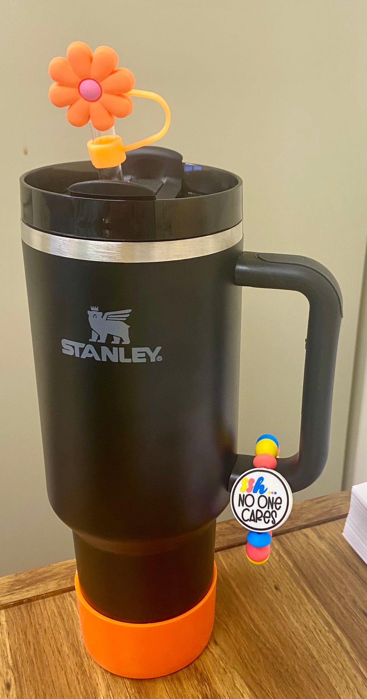 Accessorize your favorite tumbler cup with this adorable Neon Orange Daisy Flower w/Pink Center Straw Topper. This cover fits 10mm/0.4inch straws and is compatible with Stanley 30 & 40 oz tumblers straws. Made from silicone.