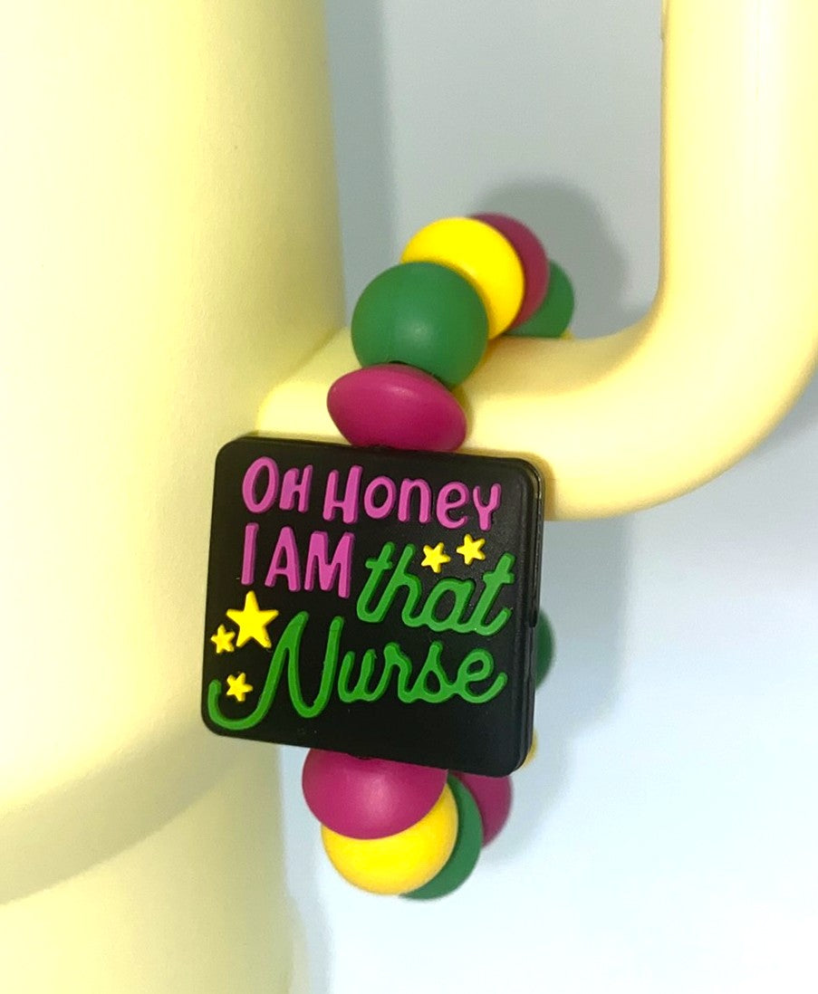 Accessorize your tumbler cup with this funny Oh Honey I Am That Nurse silicone bead cup charm. These cup charms are made to clasp around your favorite tumblers handle. They are simple to take off and put on, so depending on your mood for the day, you can swap them out easily!