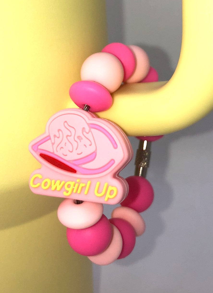 Accessorize your tumbler cup with this adorable Pink Cowgirl Up Cowboy Hat silicone bead cup charm. These cup charms are made to clasp around your favorite tumbler's handle. They are simple to take off and put on, so depending on your mood for the day, you can swap them out easily!