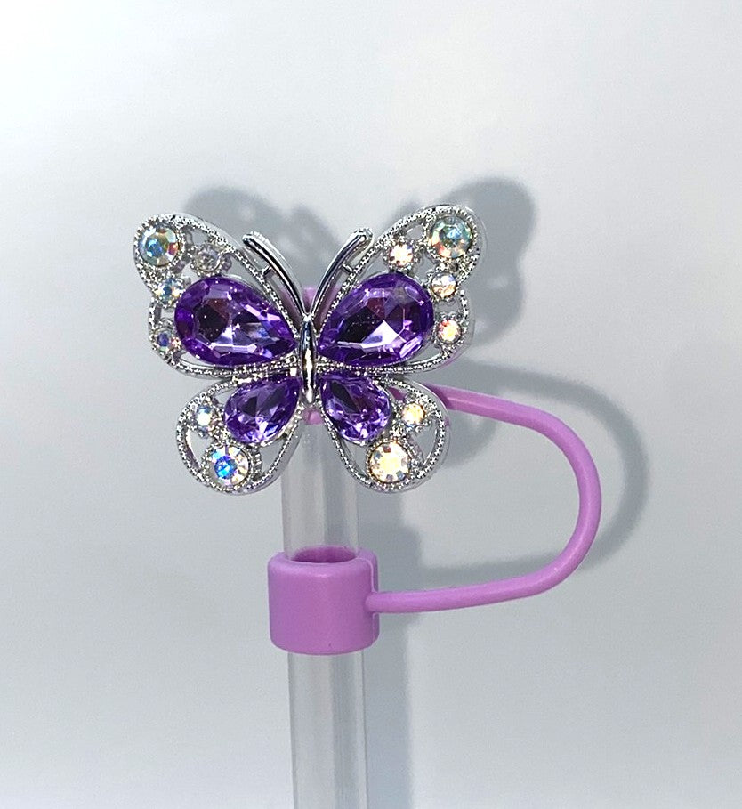 Accessorize your favorite tumbler cup with this adorable Purple Crystal Butterfly Straw Topper. This cover fits 10mm/0.4inch straws and is compatible with Stanley 30 & 40 oz tumblers straws. Made from plastic & silicone.