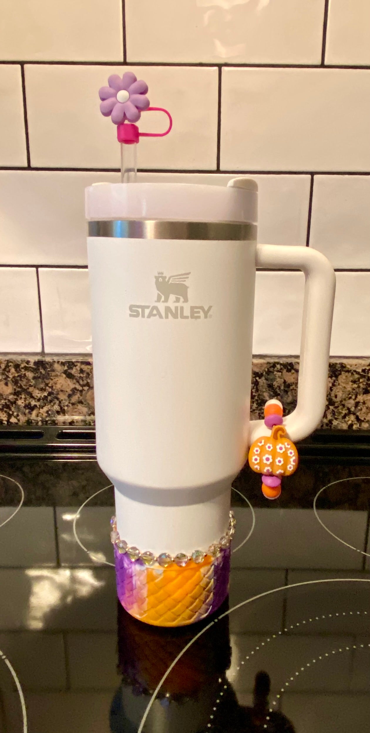 Accessorize your favorite tumbler cup with this adorable Purple Daisy Flower w/White Center Straw Topper. This cover fits 10mm/0.4inch straws and is compatible with Stanley 30 & 40 oz tumblers straws. Made from silicone.