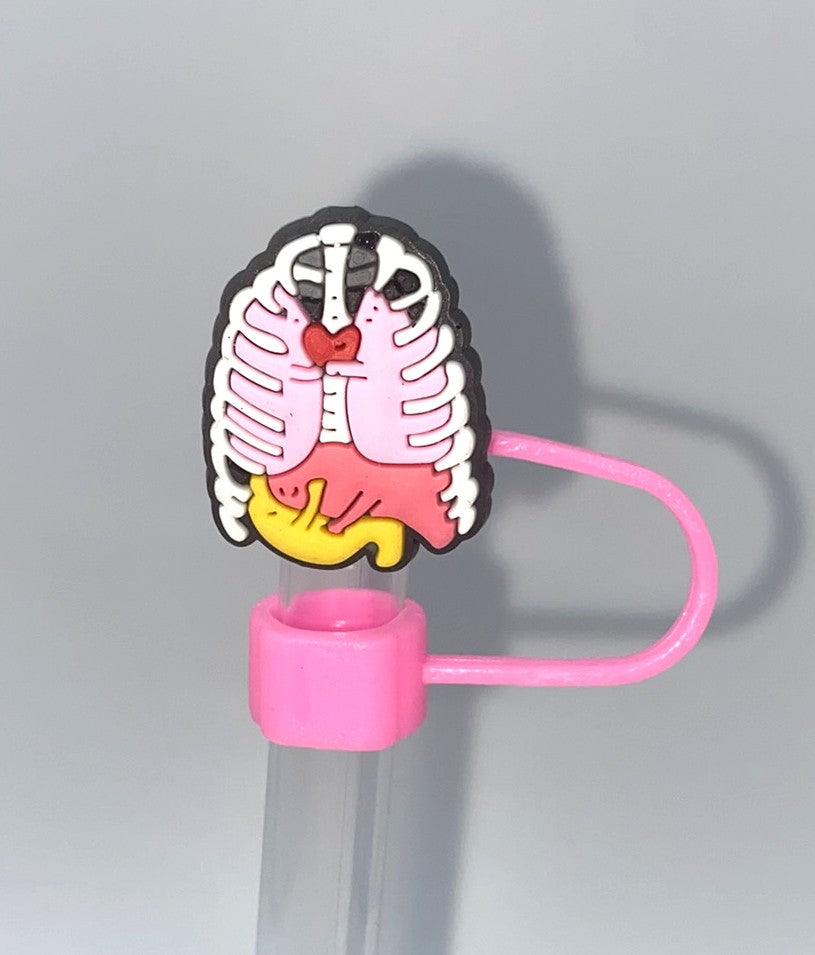 Accessorize your favorite tumbler cup with this adorable Skeletal Chest Cavity Straw Topper. This cover fits 10mm/0.4inch straws and is compatible with Stanley 30 & 40 oz tumblers straws. Made from silicone.