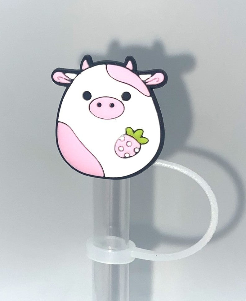 Accessorize your favorite tumbler cup with this adorable Squishmallow White w/Pink Spots & Strawberry Cow Straw Topper. This cover fits 10mm/0.4inch straws and is compatible with Stanley 30 & 40 oz tumblers straws. Made from silicone.