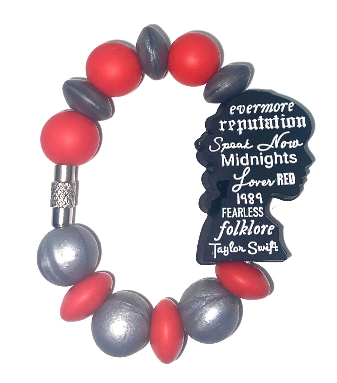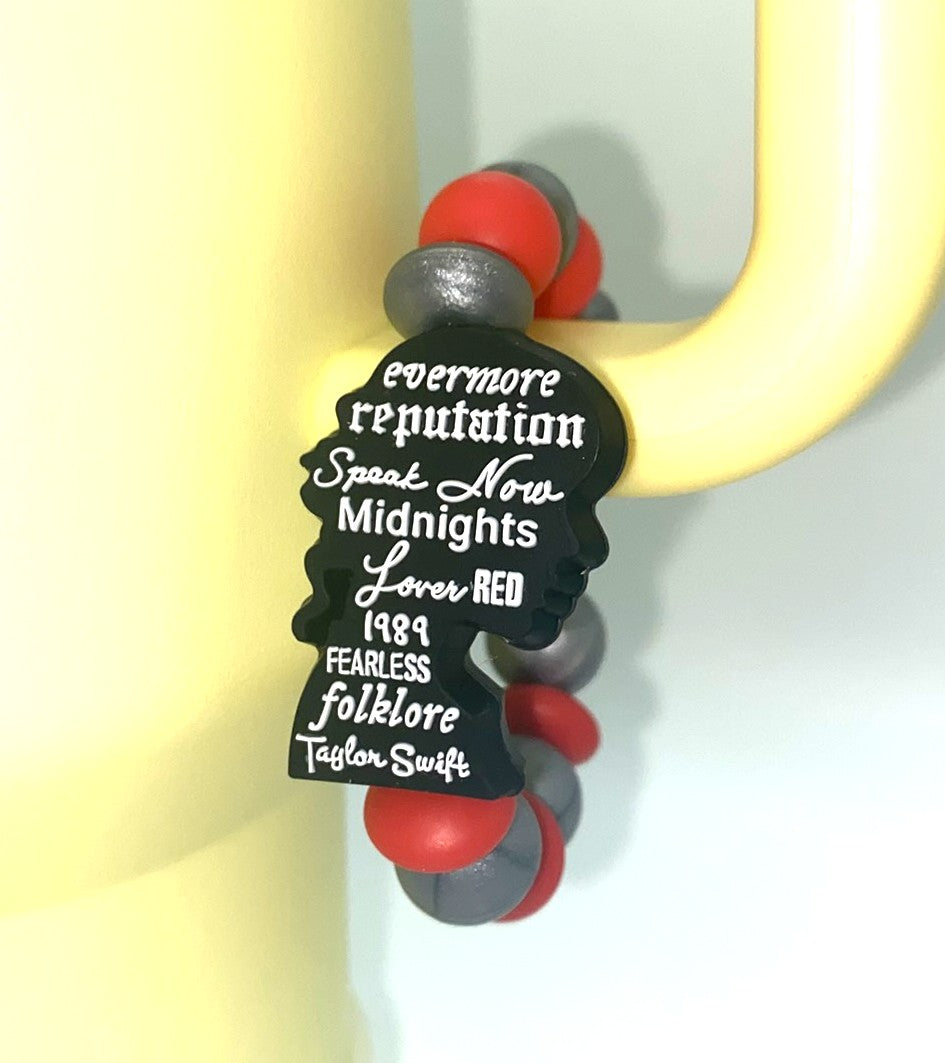 Accessorize your tumbler cup with this adorable Eras Swift Singer Silhouette Album Names silicone bead cup charm. These cup charms are made to clasp around your favorite tumbler's handle. They are simple to take off and put on, so depending on your mood for the day, you can swap them out easily!