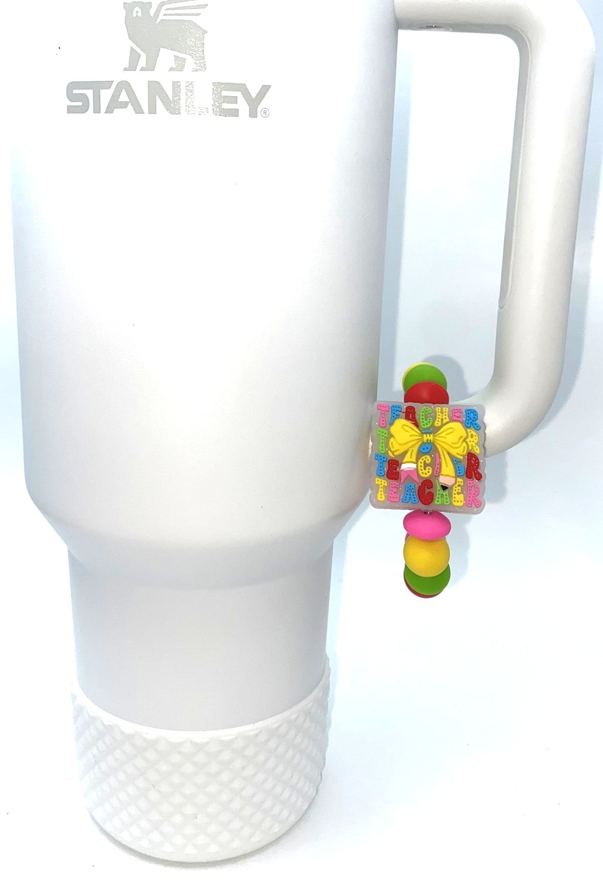 Accessorize your tumbler cup with this adorable Teacher Coquette Pencil Bow Glitter silicone bead cup charm. These cup charms are made to clasp around your favorite tumbler's handle. They are simple to take off and put on, so depending on your mood for the day, you can swap them out easily!