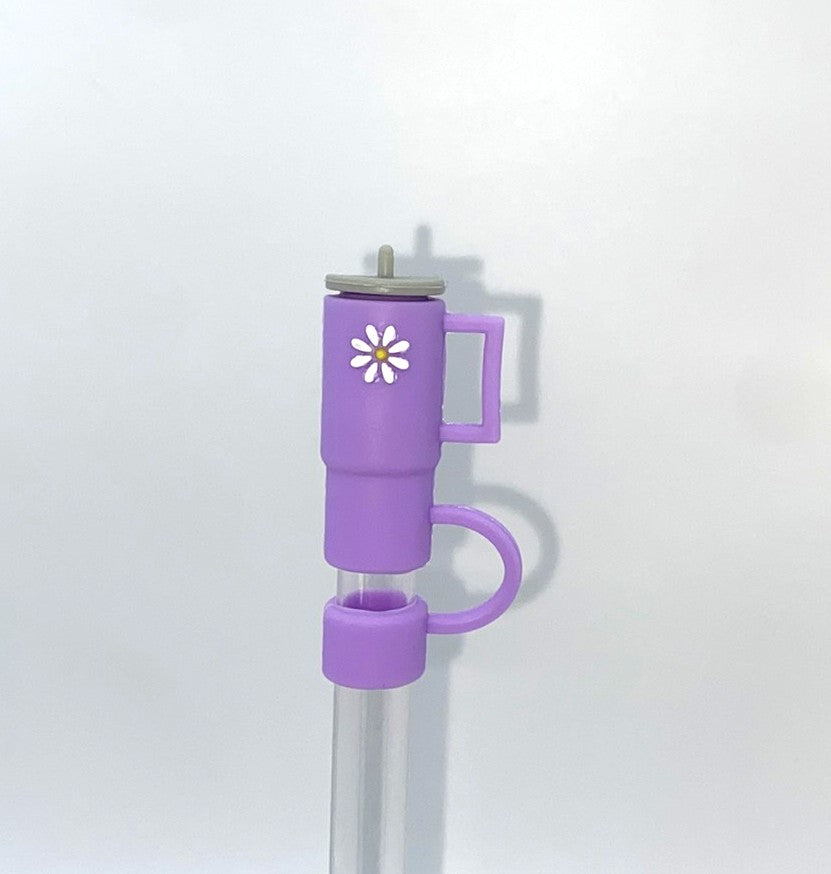Accessorize your favorite tumbler cup with this adorable Tumbler Purple w/White Flower Straw Topper. This cover fits 10mm/0.4inch straws and is compatible with Stanley 30 & 40 oz tumblers straws. Made from silicone.