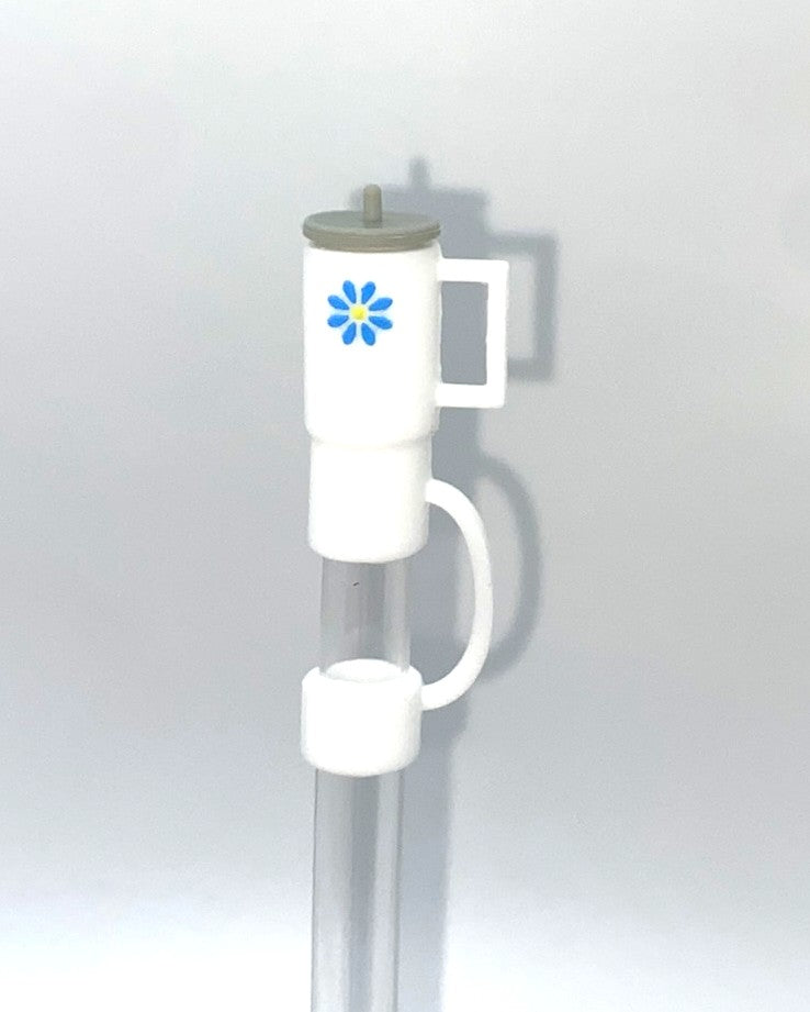 Accessorize your favorite tumbler cup with this adorable Tumbler White w/Blue Flower Straw Topper. This cover fits 10mm/0.4inch straws and is compatible with Stanley 30 & 40 oz tumblers straws. Made from silicone.