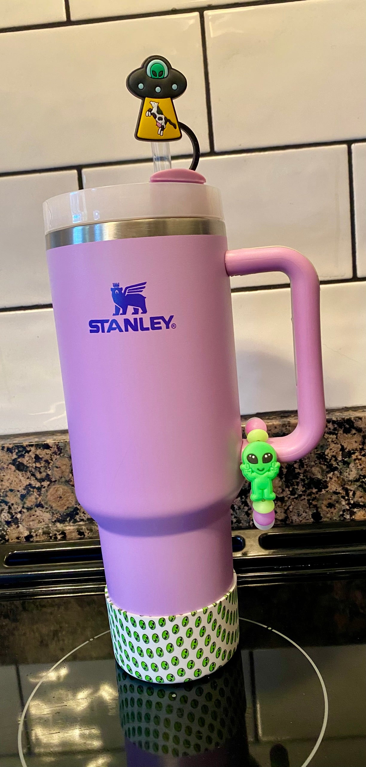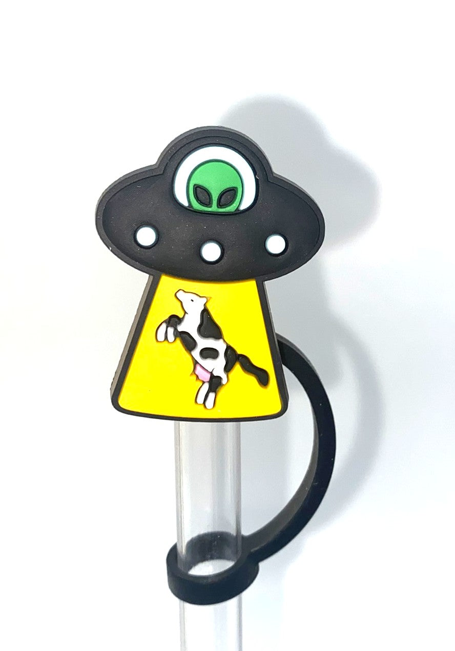 Accessorize your favorite tumbler cup with this adorable Black UFO Beaming Up Cow Straw Topper. This cover fits 10mm/0.4inch straws and is compatible with Stanley 30 & 40 oz tumblers straws. Made from silicone & PVC plastic BPA free.