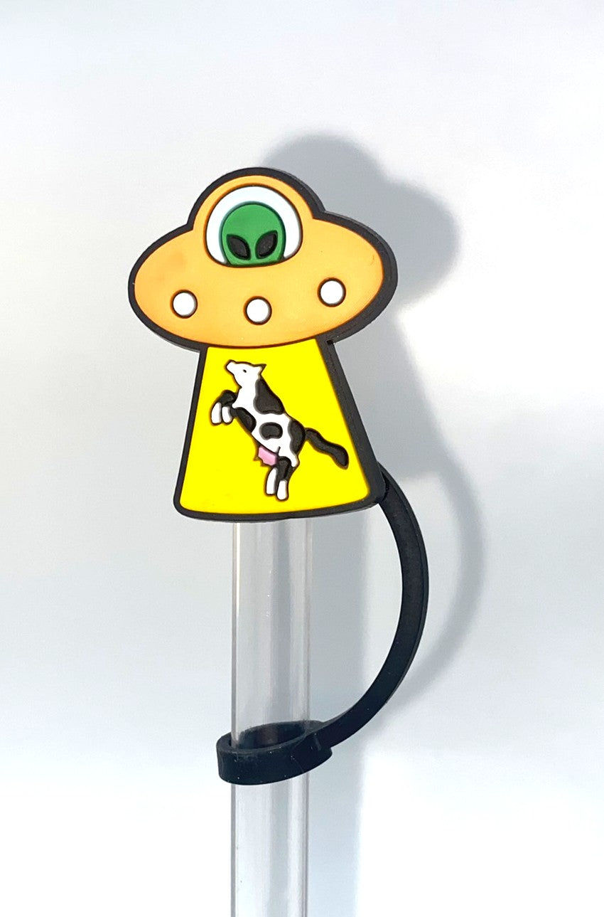 Accessorize your favorite tumbler cup with this adorable Orange UFO Beaming Up Cow Straw Topper. This cover fits 10mm/0.4inch straws and is compatible with Stanley 30 & 40 oz tumblers straws. Made from silicone & PVC plastic BPA free.