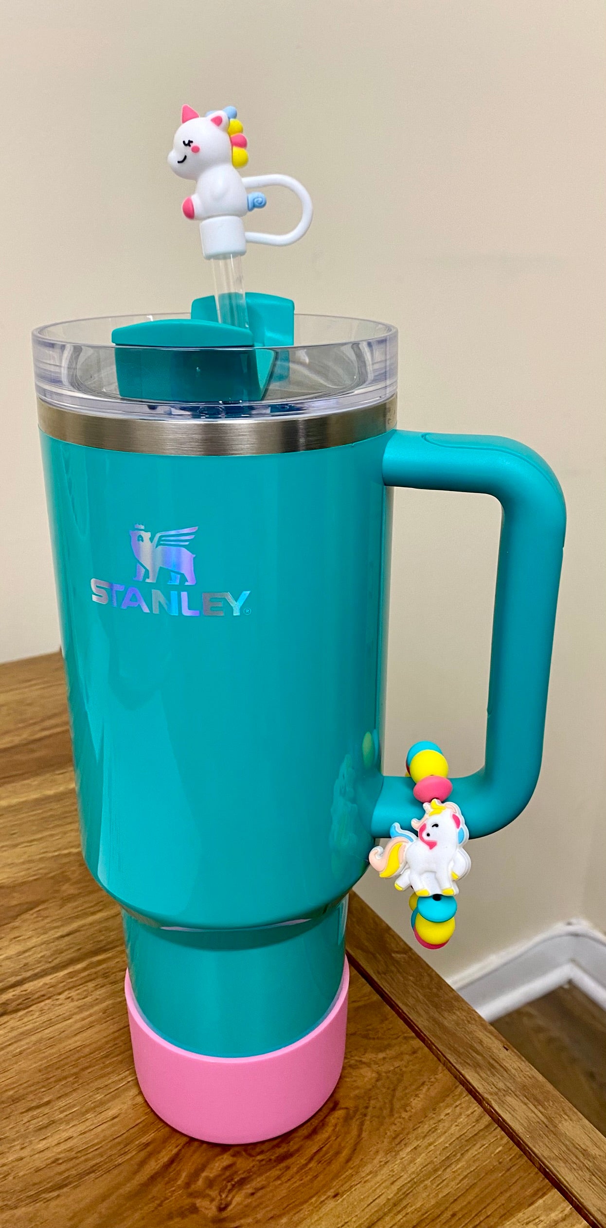 Accessorize your favorite tumbler cup with this adorable 3D Sitting Unicorn Straw Topper. This cover fits 10mm/0.4inch straws and is compatible with Stanley 30 & 40 oz tumblers straws. Made from PVC plastic BPA free.