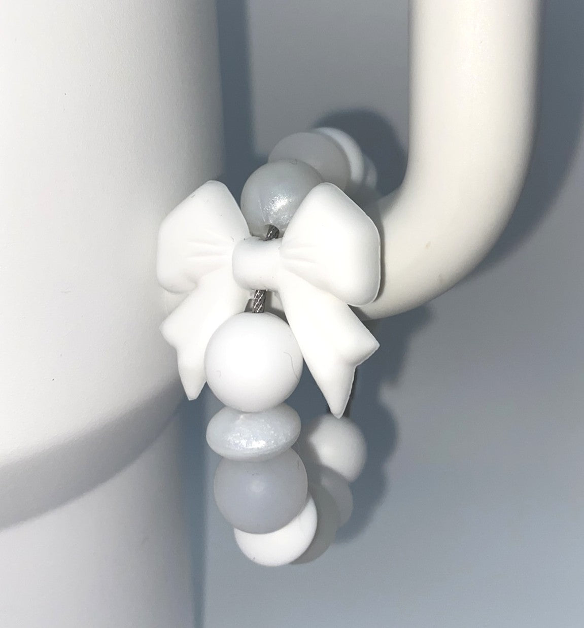 Accessorize your tumbler cup with this adorable White Bow silicone bead cup charm. These cup charms are made to clasp around your favorite tumbler's handle. They are simple to take off and put on, so depending on your mood for the day, you can swap them out easily!